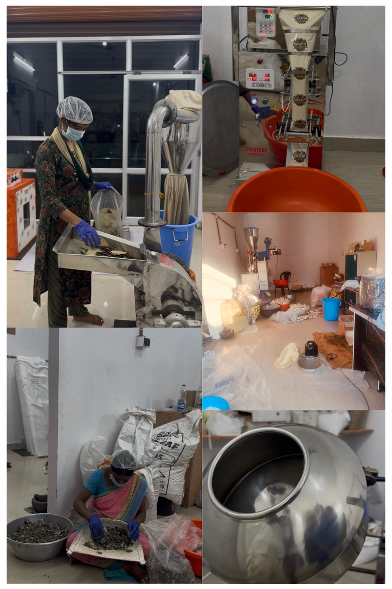 Behind the scenes at Ankapur Premium Masala showing hygienic spice processing, handpicked ingredients, modern equipment, and careful preparation that ensures purity, freshness, and authentic Telangana flavour in every pack.