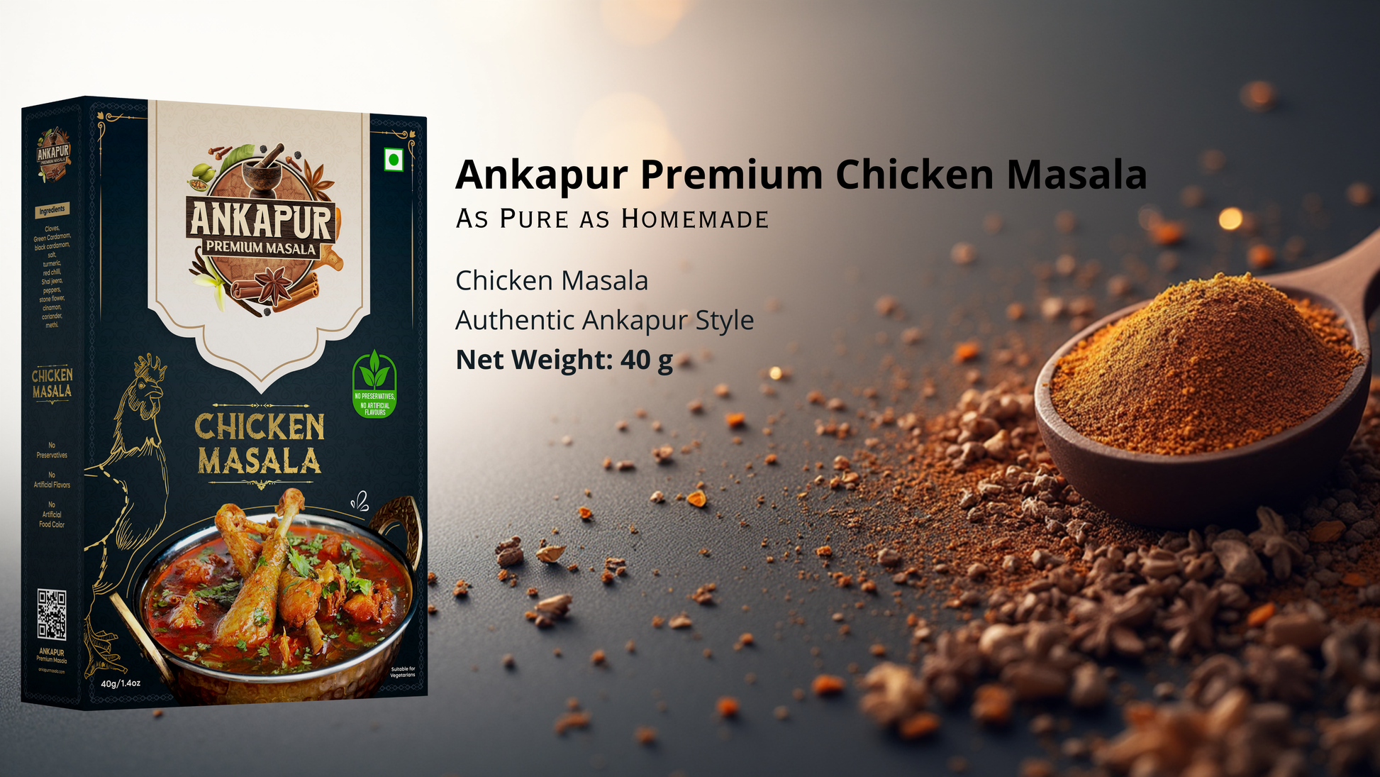 A bold and aromatic Village-style chicken curry, crafted with our signature Ankapur Premium Chicken Masala (40 g) β known for its perfect balance of heat, aroma, and depth of flavor.