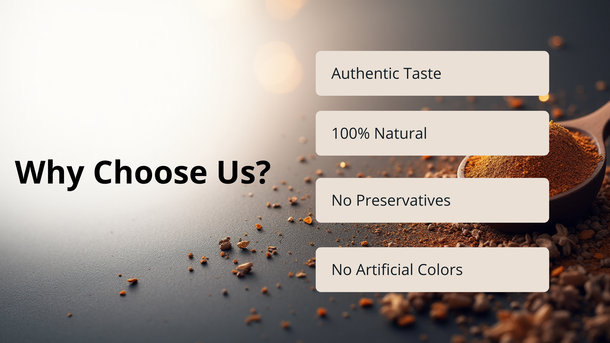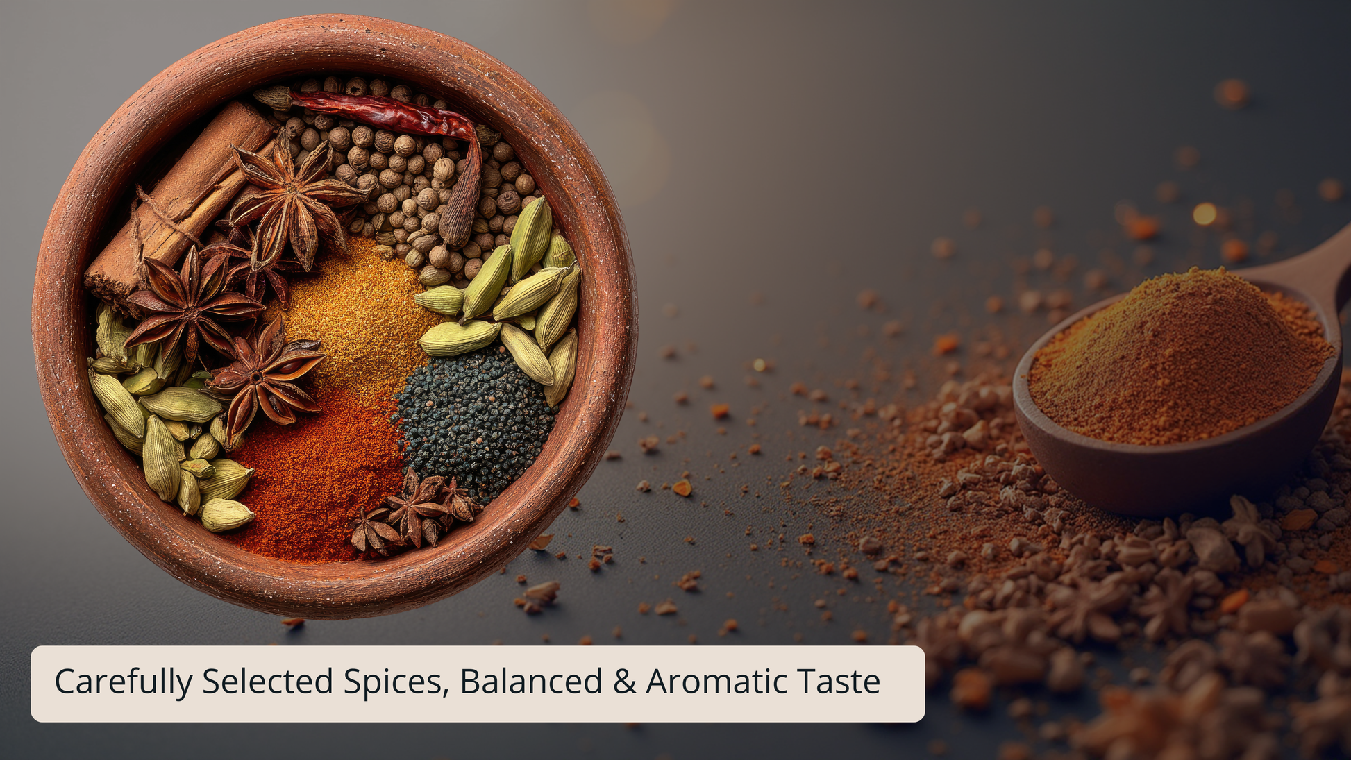 A carefully curated blend of first-quality, handpicked spices β including cloves, cardamom, shahijeera (caraway seeds), bay leaves, stone flower (dagad phool), black cardamom, cinnamon sticks, black pepper, turmeric, coriander, dried methi leaves, and red chilies β all slow-roasted and stone-ground to perfection.